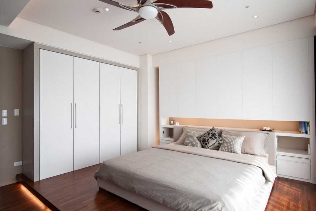 - Организовать маленькую гардеробную за изголовьем кровати. Для этого необходимо оставить минимум 50 см для глубины шкафа или гардеробной системы + 70 см для прохода.