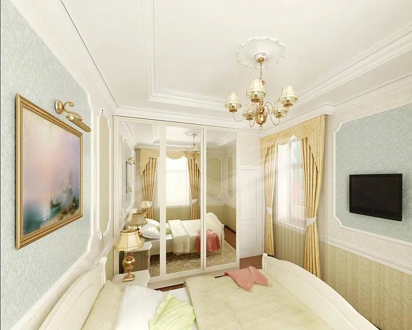 Наличие зеркала. Зеркальные покрытия в узких спальнях делают масштабными. Только их размещают вдоль стены так, чтобы спальное место не отражалось.