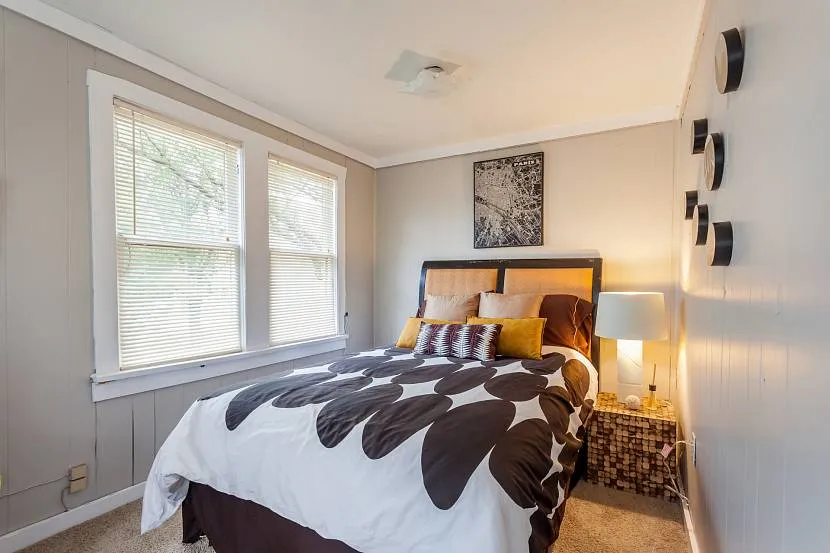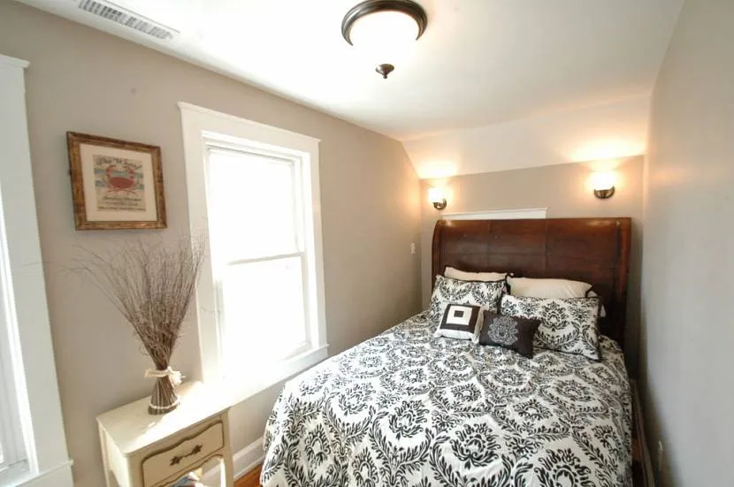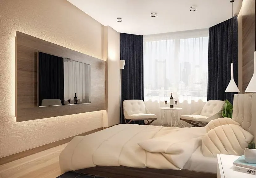Удобное зонирование. В малогабаритных спальнях стараются не конструировать искусственные перегородки. Зонирование проводится с помощью акцентов, предметов мебели, отделочных материалов.