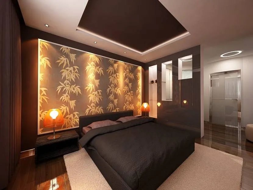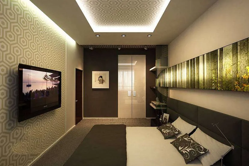 Узкая спальня с подсветкой в виде длинной картины над кроватьюИсточник faqindecor.com