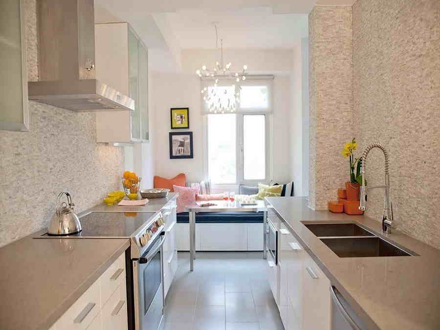Под кухонный гарнитур можно отдать лишь часть длинной стены. Оставшееся пространство у короткой стены может служить обеденной зоной. Это достаточно удачное решение. Еще можно посоветовать использовать полупрозрачные стулья.