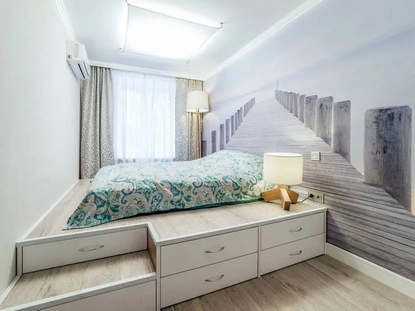 Искусственный подъем позволит четко обозначить определенную зону комнаты. Довольно эффективным в таком случае будет решение поставить на него кровать и отвести эту зону под спальню, а место под ним использовать как еще одну маленькую кладовку.