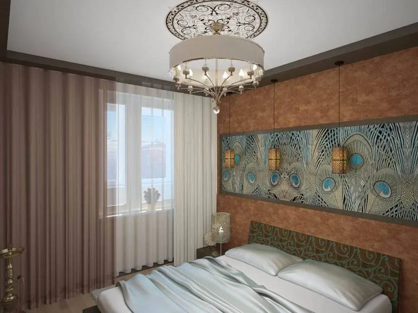 Узкая спальня с декоративным оформлением кроватиИсточник mirdizajna.ru