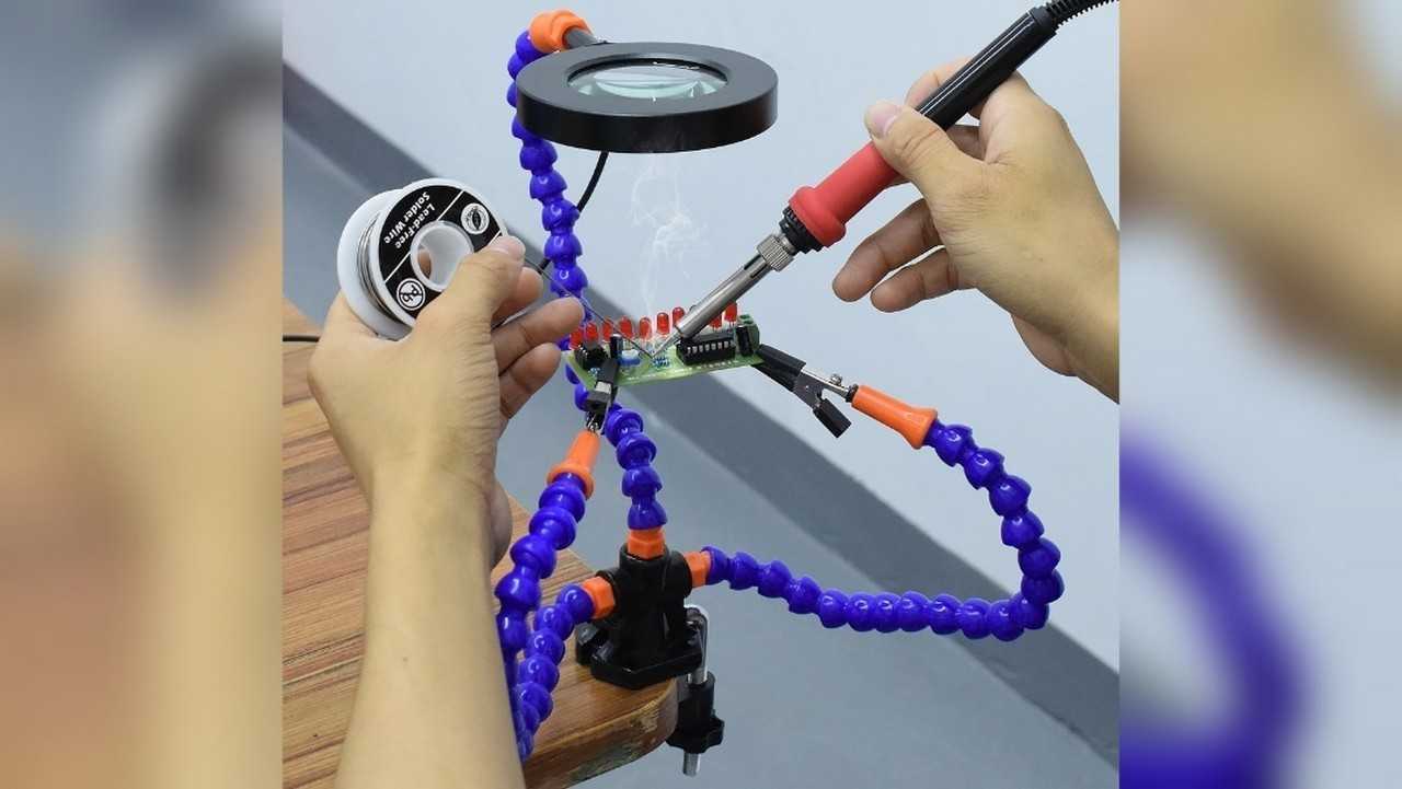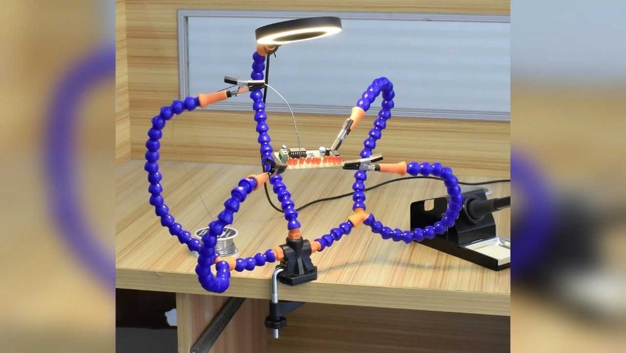 Идём далее – удобная штуковина, с помощью которой перед пайкой можно надежно закрепить печатную плату. Гибкие манипуляторы оснащаются зажимами типа «крокодил».
