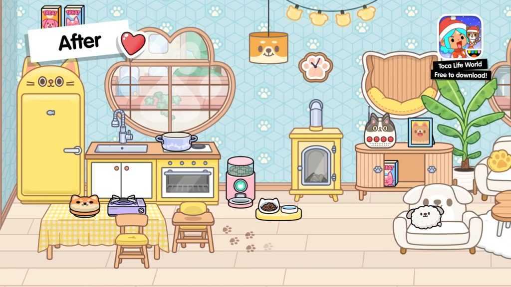 Далее мы перейдём к первой большой комнате нового коттеджика. Ребята, вы только посмотрите, сколько мебели для кухни мы получим бесплатно. Это и новый желтый гарнитур + столик со стульями, и классный камин, и большой выбор мисочек для питомцев. Разработчики Тока Бока добавили автомат для еды, встроенную в стену лежанку, кресла с диваном и журнальный столик в виде косточки.