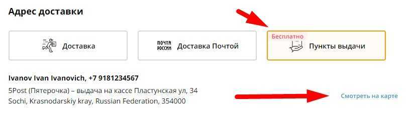 Выбираем «Пункты выдачи». Автоматически система покажет ближайший пункт самовывоза. В данном случае это магазин «Пятерочка».
