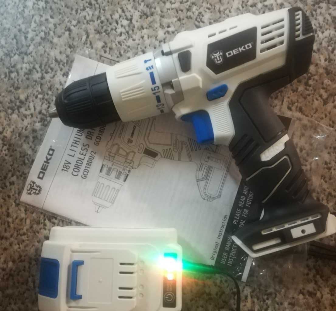 Шуруповёрт от компании DEKO, который подходит для работы с совершенно разнообразными материалами такими, как дерево или пластик, металл или стекло, представляет собой сравнительно небольшой аппарат, размерами 22*7,5*22 сантиметра, корпус его сделан из прочного и качественного пластика и работает на перезаряжаемом литий-ионном аккумуляторе. Продавец предлагает на выбор несколько вариантов комплектации, во втором варианте, помимо зарядного устройства и самого шуруповёрта, поставляется дополнительный аккумулятор, а в третьем варианте, инструмент приходит в прочном, фирменном кейсе, с дополнительным аккумулятором и несколькими сменными насадками.