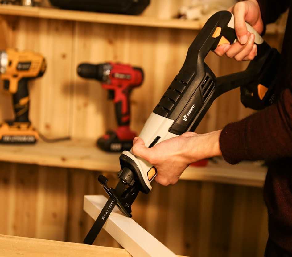 Сабельная пила подойдёт для большинства ремонтных и плотницких работ. Этот инструмент от бренда DEKO поставляется с четырьмя лезвиями для резки разнообразных материалов. Он полностью беспроводной и работает от аккумуляторных батареек: их заряда хватает на час работы. По соображениям безопасности пила оснащена двойным переключателем: чтобы запустить её, нужно зажать две кнопки. Чувствительность и скорость резки можно регулировать.