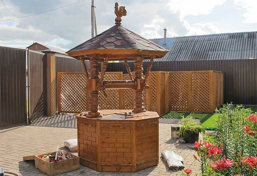 Деревянные конструкции создают уют и теплоту. Особенно красиво смотрятся резные и искусственно состаренные колодцы для декора: