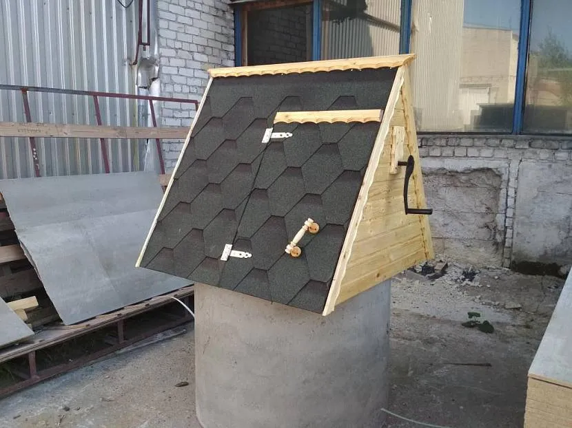 Оголовки колодцев с питьевой водой, сделанные из других материалов, требуют дополнительной отделки. Проще всего обшить поверхность доской, можно использовать вагонку либо материал, имитирующий брус.