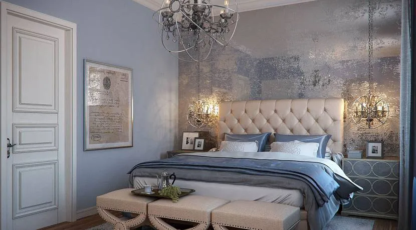 Модерн. К этому стилю подойдет голубой с металлическими нотками. Он прекрасно сочетается с любой мебелью и текстилем. Не забудьте о зеркалах и отражающих поверхностях