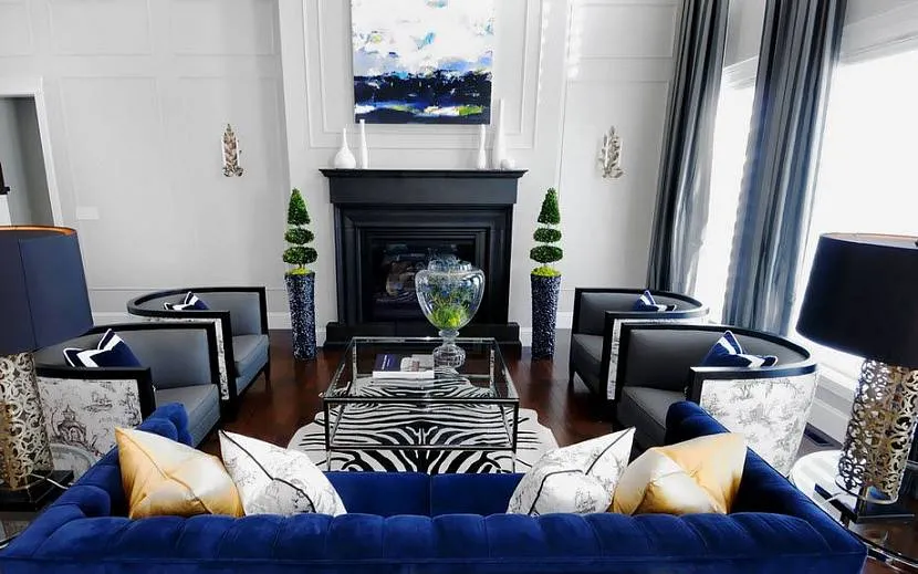 Красочные вкрапления в интерьере зала в сочных голубых, ультрамариновых или васильковых тонах, могут использоваться в любом количестве. В качестве насыщенных элементов выбирают мягкую мебель с обшивкой в оранжевых оттенках, устанавливают торшер с фиолетовым абажуром или украшают окна с помощью вишневых штор.