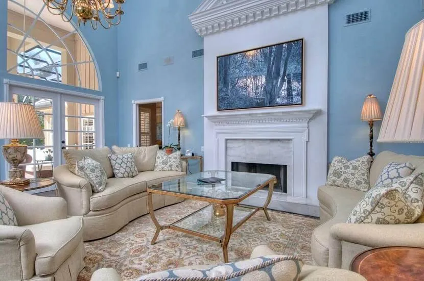 Неоклассицизм. Голубой привнесет в интерьер торжественность и простор. Витиеватая мебель, необычные, но богатые принты. Темные массивные предметы станут завершающим акцентом.