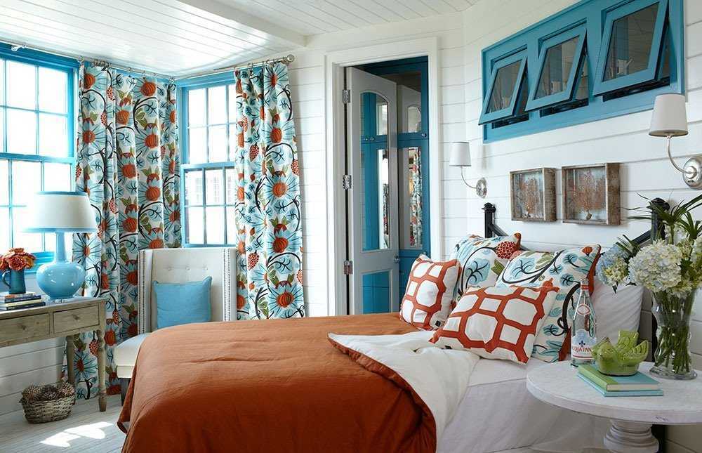 - Яркие цветовые схемы невозможно дополнить блеклыми и невыразительными портьерами, неброские узоры в таком интерьере теряют присущую им привлекательность. Если подобрать насыщенный оттенок для занавесей не удается, удачным решением станет белоснежное полотно с перламутровым отливом.