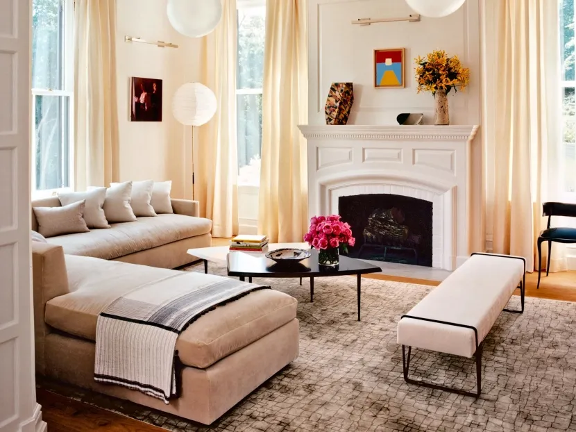 Светлая гостиная в теплых тонахИсточник architecturaldigest.com