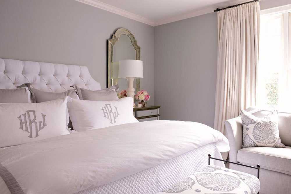 Стандартное оформление спальни в холодных бело-голубых тонах с использованием обоев и занавесей облегченной структурыИсточник designer-info.ru