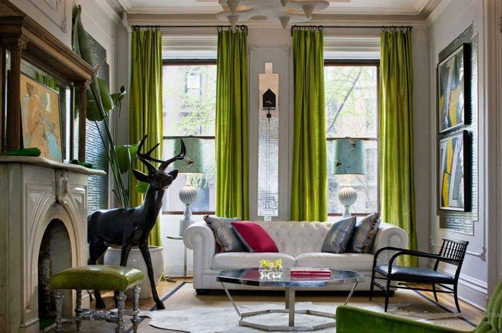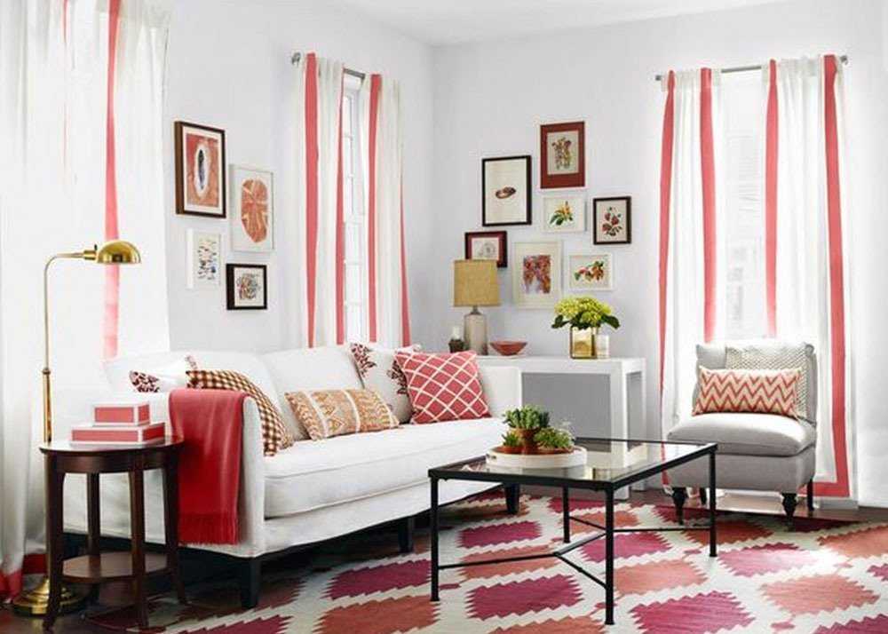 С чем сочетать такие яркие занавески, когда на стенах белые обои? Обыграть их можно с диваном, покрывалами, ковром, мелочами вроде рамки для фотографий, вазы или абажура.