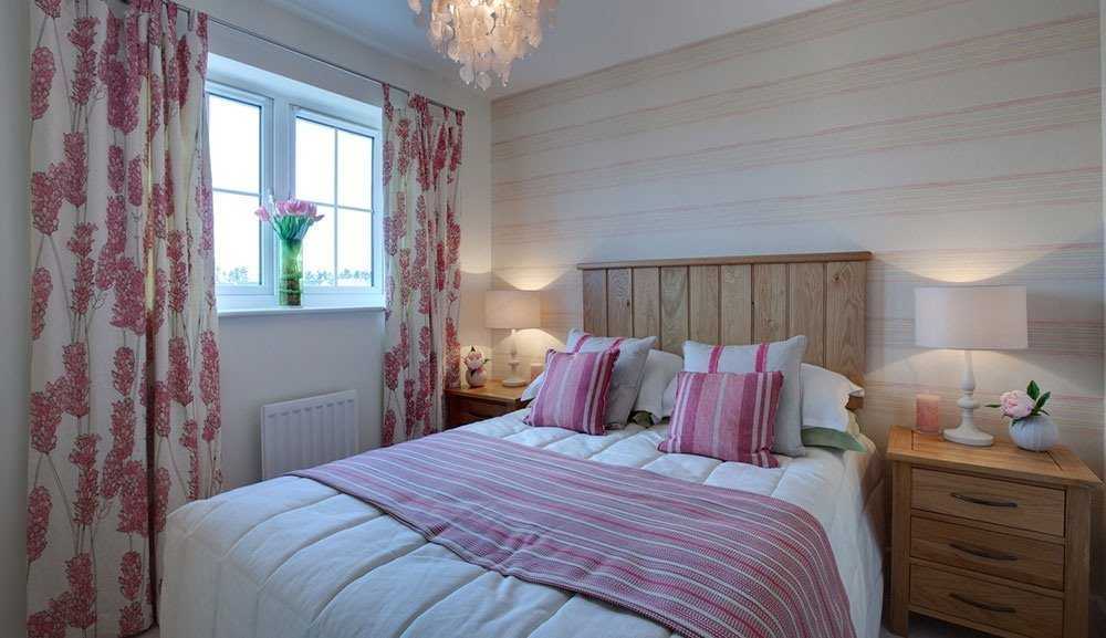 - Для романтического интерьера спальни подойдут бледно-розовые или бледно-лиловые портьеры.