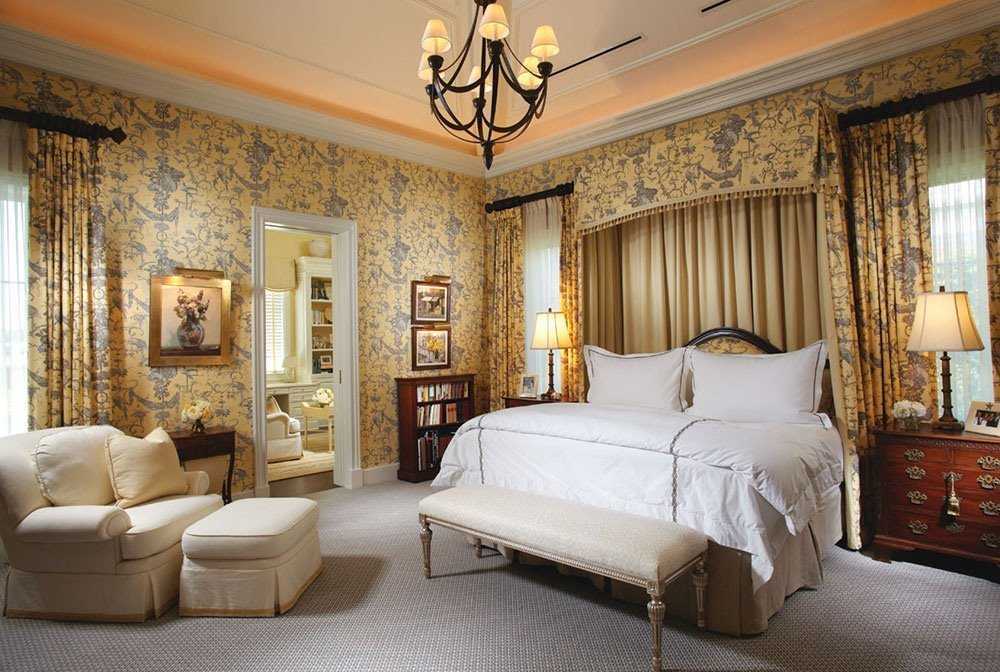 Шторы, покрывало и балдахин одного цвета. Спальня в стиле кантри