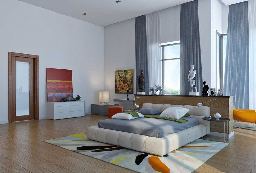 Нейтральный цвет штор в спальне, который поддерживается другими интерьерными элементами и текстилем. Изменить настроение этой комнаты будет несложно.