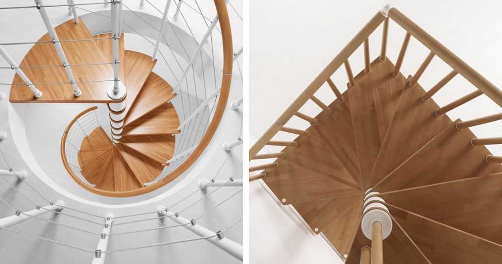 Однако стоит отметить, что во всех разновидностях подступенки (если они присутствуют) и ступеньки крепятся таким образом, чтобы в результате получилось что-то наподобие резьбы стандартного винта. При рассмотрении готового изделия сверху становится понятна форма пролета. В зависимости от направления резьбы обычного винта лестничный пролет будет либо в форме круга, либо в виде многоугольника.