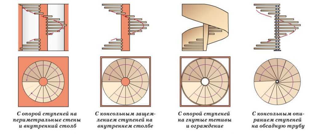 Существует несколько видов винтовых лестничных конструкций, выбор зависит от ваших личных предпочтений, места установки и особенностей помещения. Чтобы выбрать оптимальный вариант, посмотрите на фото ниже, где представлены схемы основных четырех конструкций, каждая из которых отличается способом крепления ступеней.