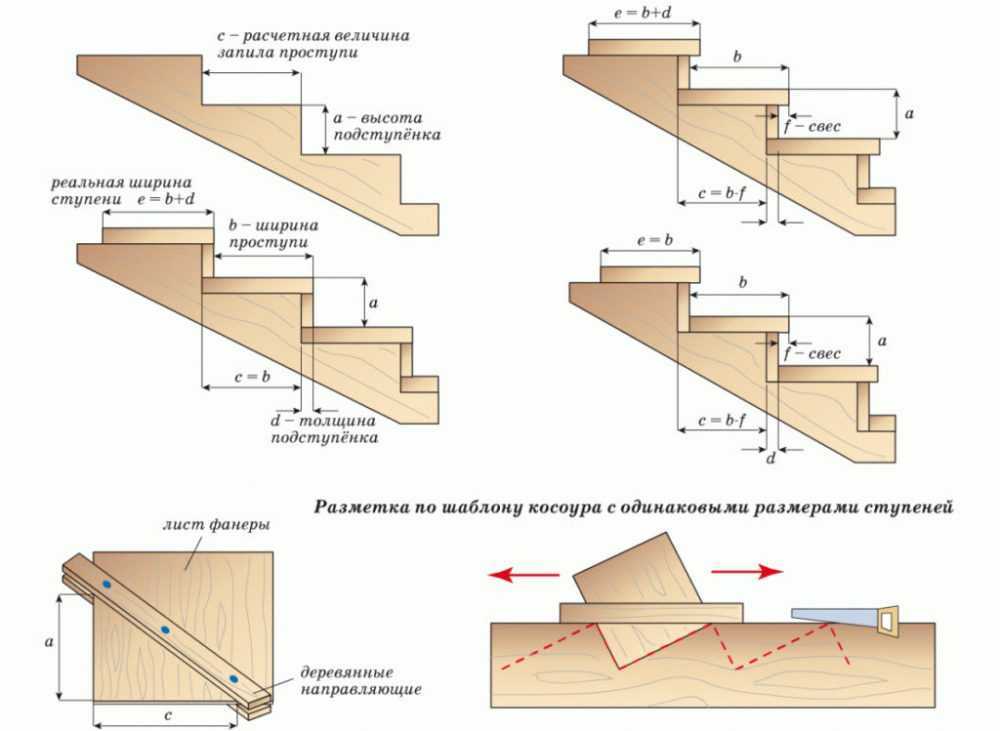 На приготовленных досках нужно отметить длину и отпилить лишнее. На бруске с помощью угольника размечают высоту подстепенка и ширину проступи с убавкой 2-4 см.
