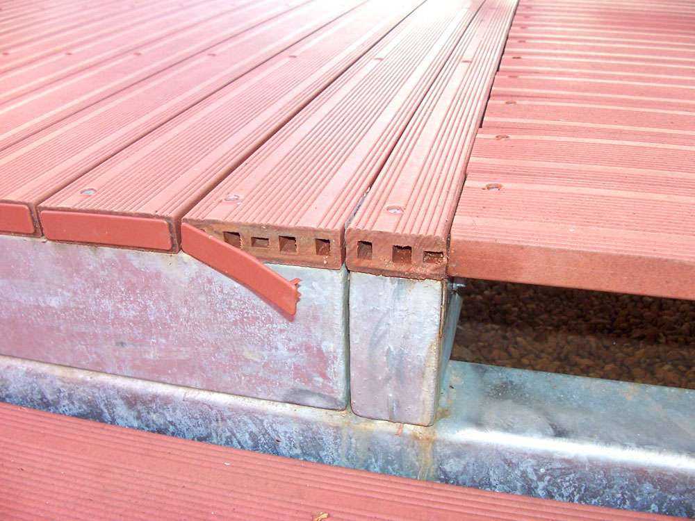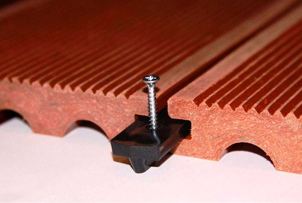 Если установка осуществляется в уличных условиях, под лагами нужно разместить плитку, чтобы получить зазор, необходимый для отведения дождевой или талой воды. Следующий этап – укладка первой доски, закрепление в ее пазах металлических клипс. В них пазом будет вставляться следующая планка, и так до момента завершения процесса. Боковые доски декорируются заглушками, скрывающими монтажные пазы.