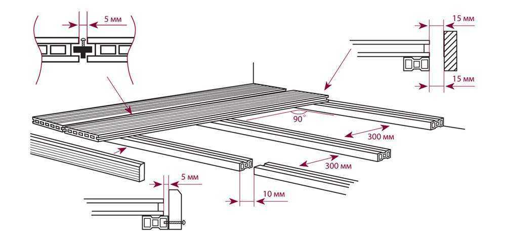- в конструкции лаг требуется предусмотреть наличие незначительного углубления для установки крепежных элементов, фиксируемых оцинкованными саморезами;
