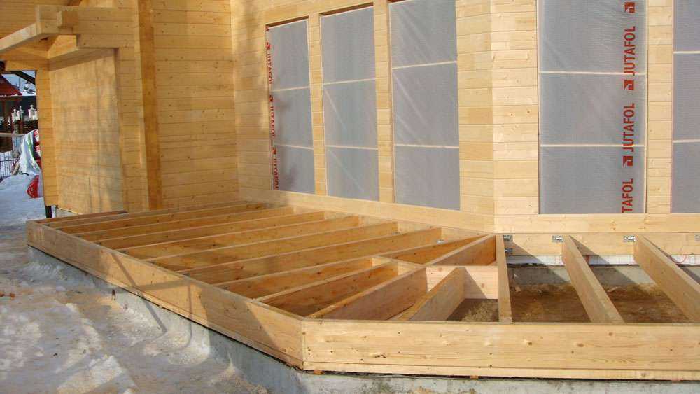 На основании размещаются деревянные лаги с шагом 35-40 см, фиксируясь саморезами. Расстояние между лагами зависит от длины доски – чем она меньше, тем ближе располагаются опорные элементы.