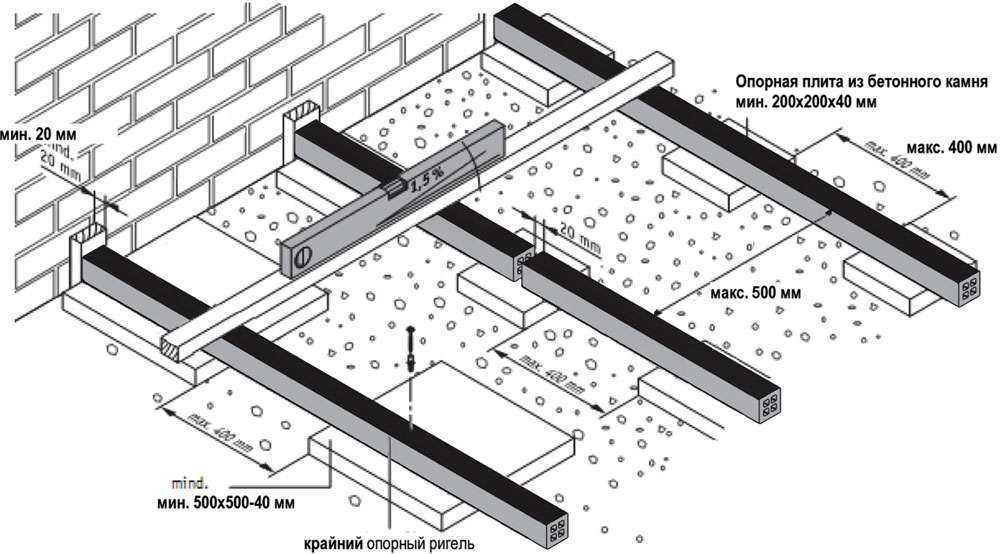 Укладка начинается с выполнения крепкой основы. С этой целью используется основание в виде цементной стяжки, покрытой слоем битумной гидроизоляции. Лаги могут быть выполнены как из древесины, так и из металла. Перед цементированием и установкой лаг в обязательном порядке осуществляется удаление всей сорной растительности и мусора, выравнивание площадки, а также обустройство системы водоотвода. Рекомендуется выполнение основы осуществляться с незначительным уклоном в направлении водоотвода.