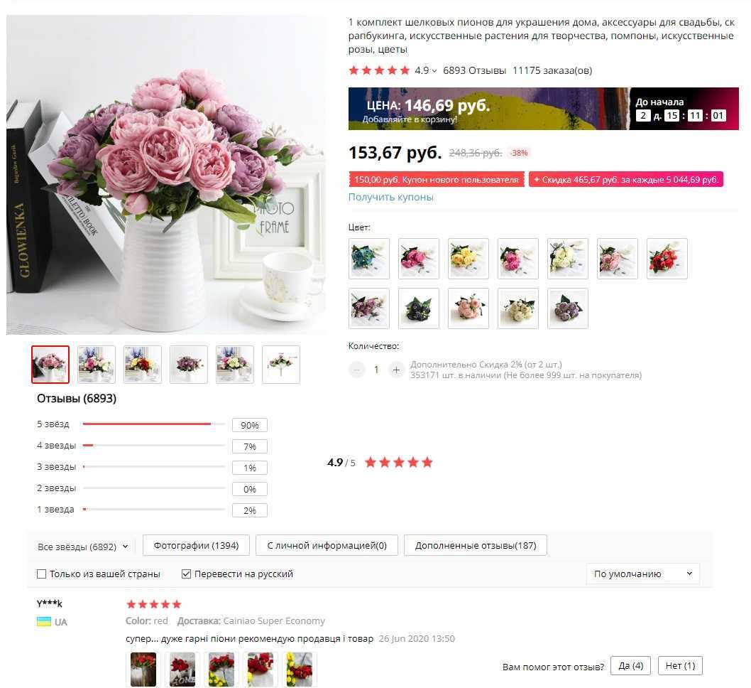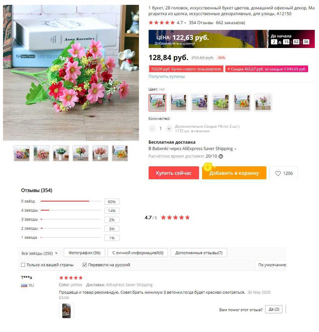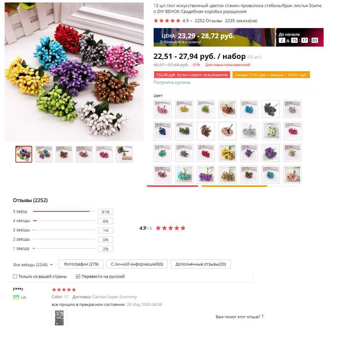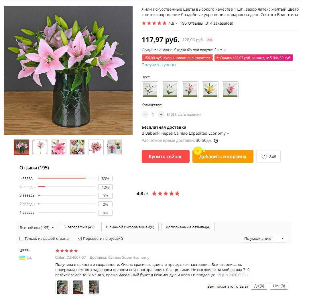 Здесь обращают внимание на комментарии о качестве пришедшего товара: наличие пластмассового запаха, отсутствие качественной проклейки материалов, выпадение лепестков из бутона и прочие параметры.