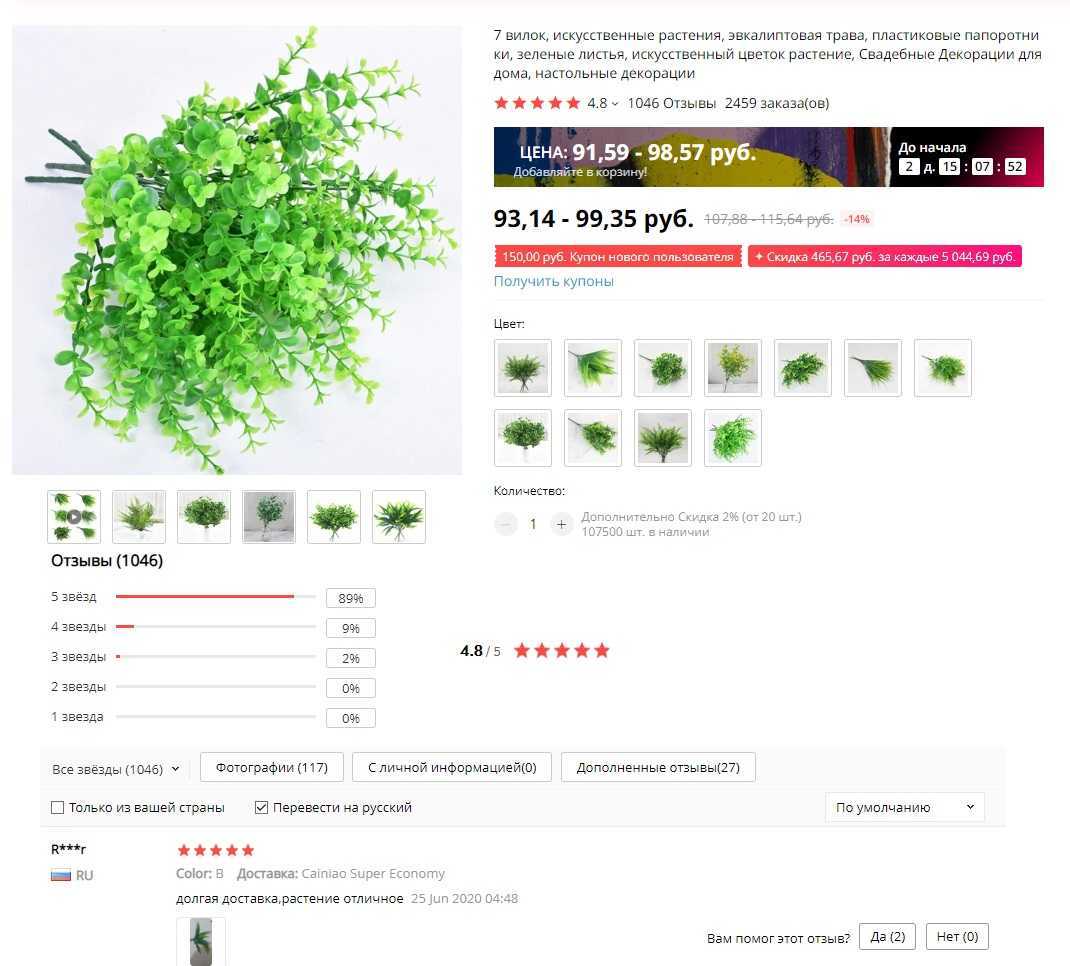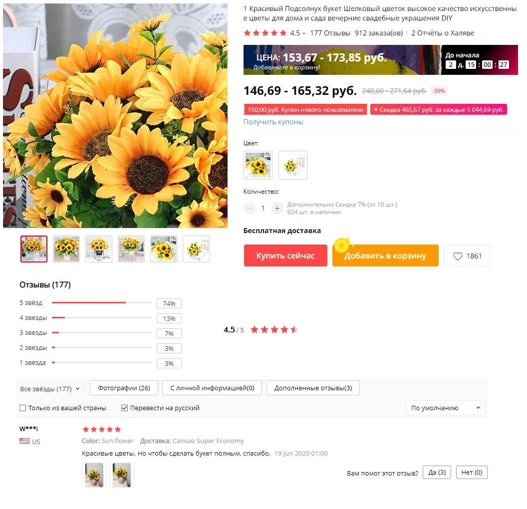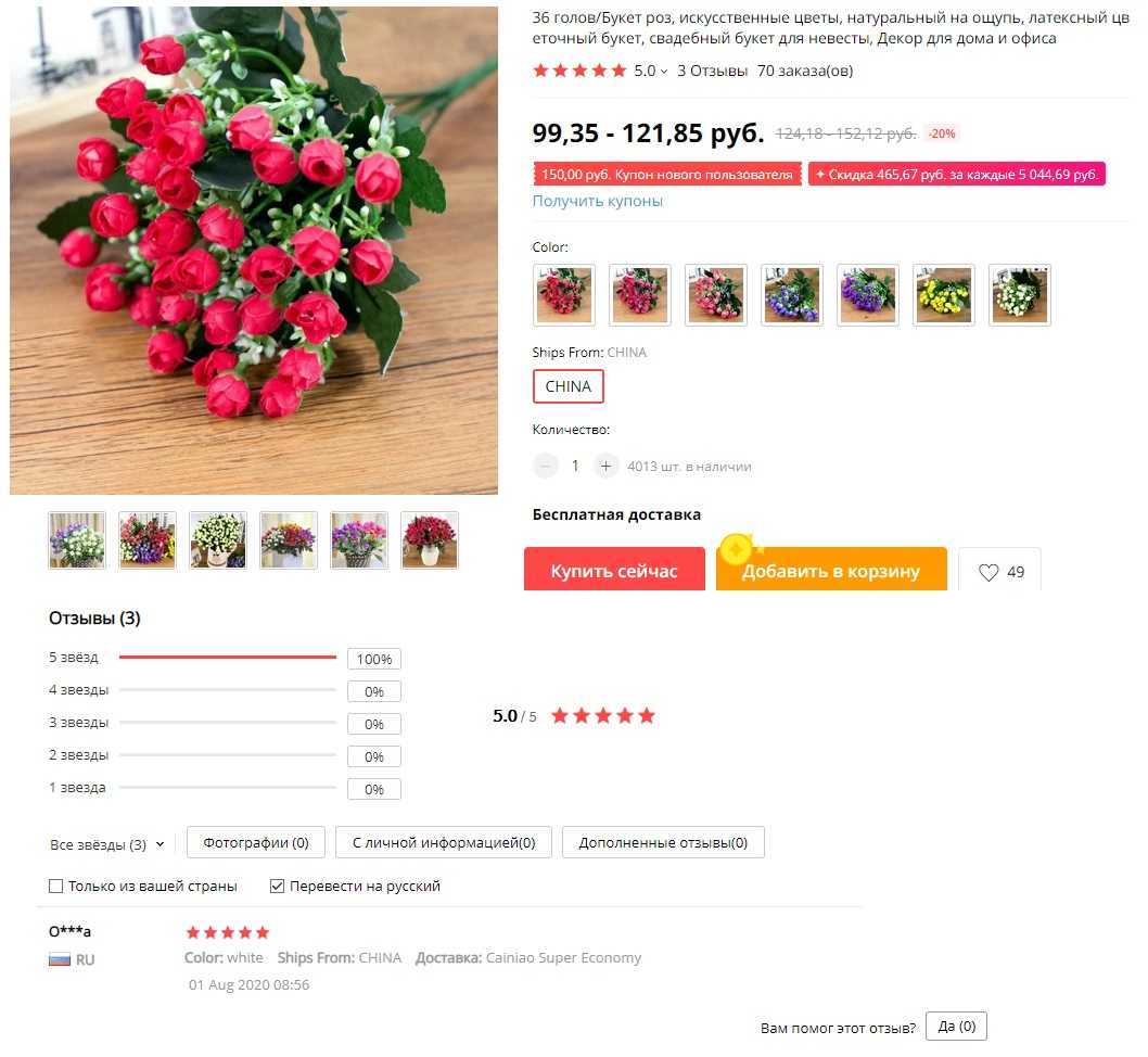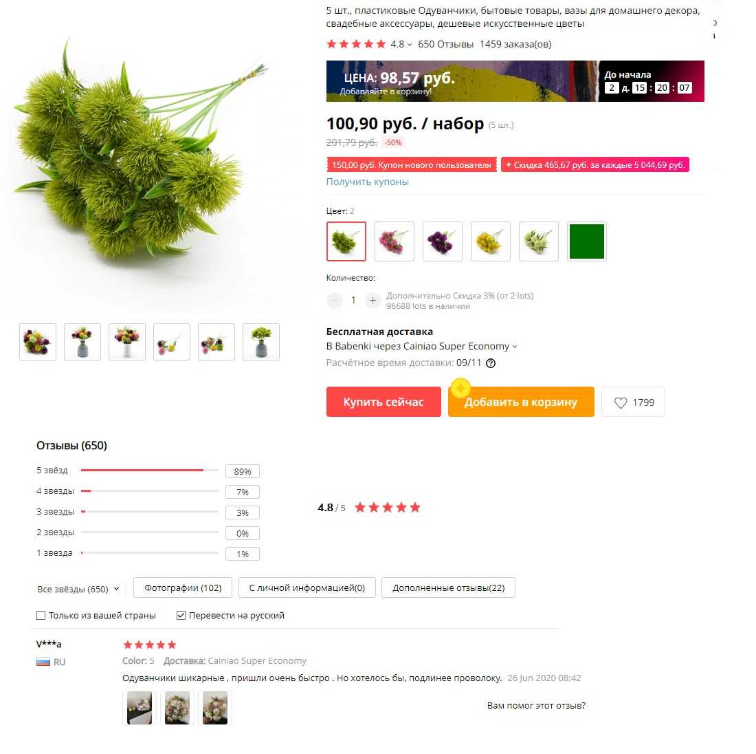Здесь обращают внимание на комментарии о качестве пришедшего товара: наличие пластмассового запаха, отсутствие качественной проклейки материалов, выпадение лепестков из бутона и прочие параметры.