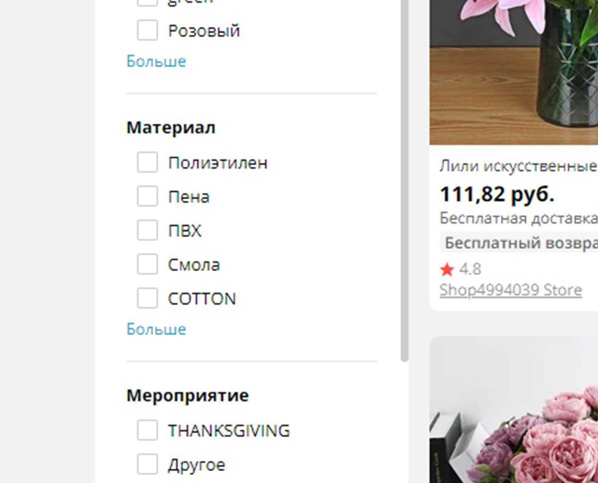 На Алиэкспресс предлагается форма для ввода нужных параметров. Находится она с левой стороны страницы. Здесь достаточно поставить галочку на нужном материале.