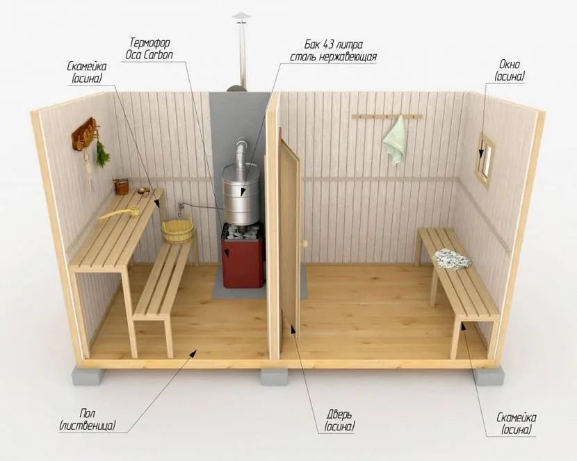 Особое внимание стоит уделить напольному основанию, обеспечив канализационный слив для снижения уровня влажности в помещениях. Дровяная каменка требует наличия надежной системы дымоотвода, которая позволит предотвратить задымление жилых помещений и оседание налета сажи на потолочной поверхности