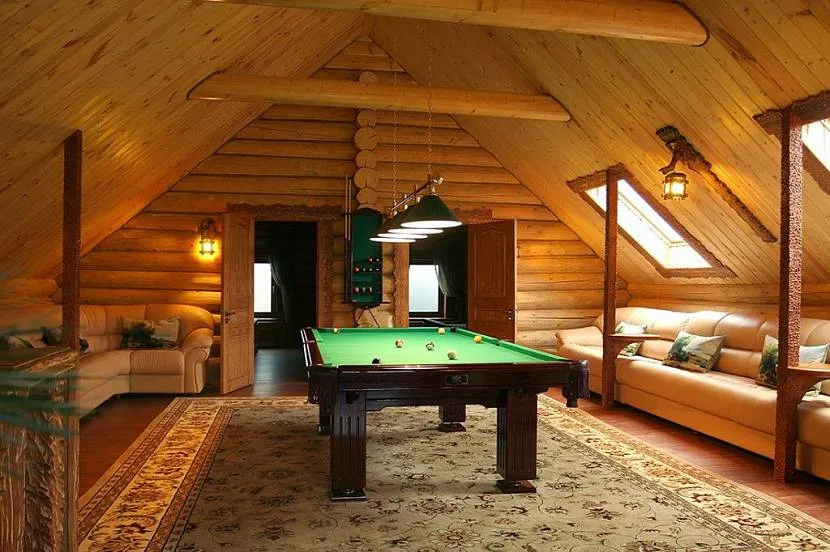 Кроме наличия бани есть проекты, предусматривающие размещение бильярдной на верхнем этажеИсточник th.aviarydecor.com