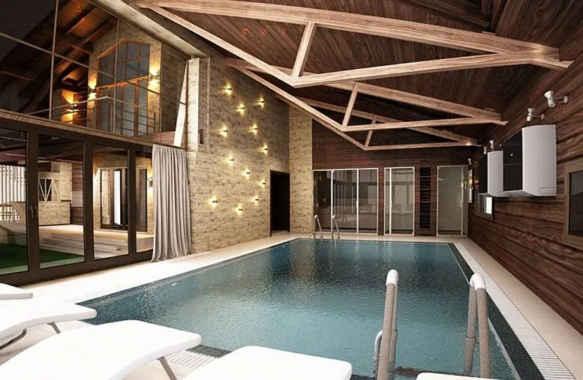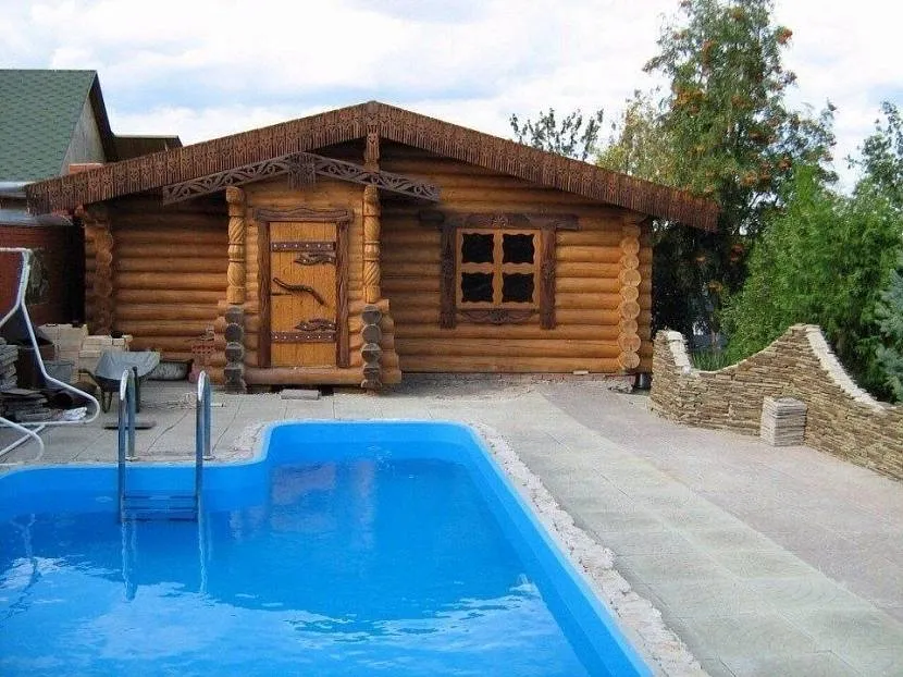 Внутренняя планировка бани с бассейном в большинстве случаев стандартная. Так, бассейн может находиться внутри бани или в пристройке. Парилку и душ для удобства размещают вблизи купели, оборудуют отдельным выходом. В хранилище для топлива устраивают 2 входа — с улицы и из здания. Комната отдыха должна располагаться рядом с помывочной и иметь выход в бассейн. Помещение для технического обслуживания отдаляют от всех остальных.