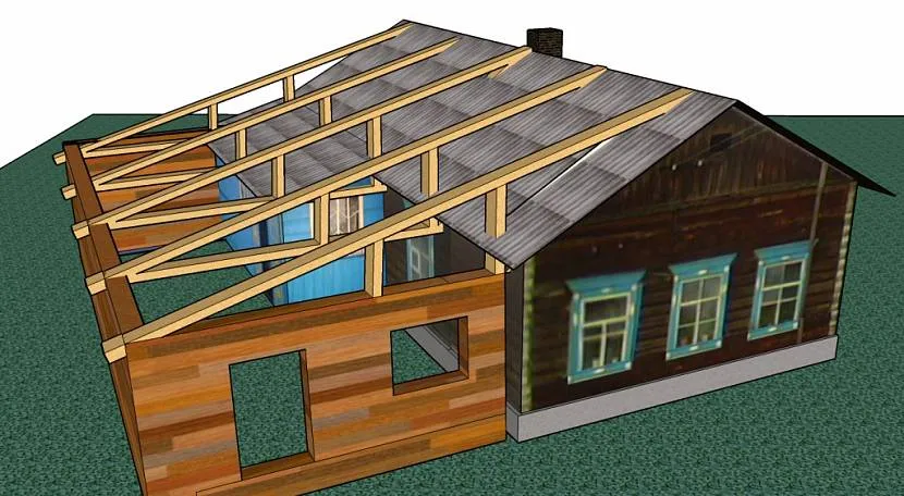 При использовании второго варианта, баня пристраиваются к дому в виде дополнительного помещения. Баня может стоять вплотную к дому или между ними делается какое-то подобие тамбура, но в любом случае и дом и баня накрываются одной крышей.