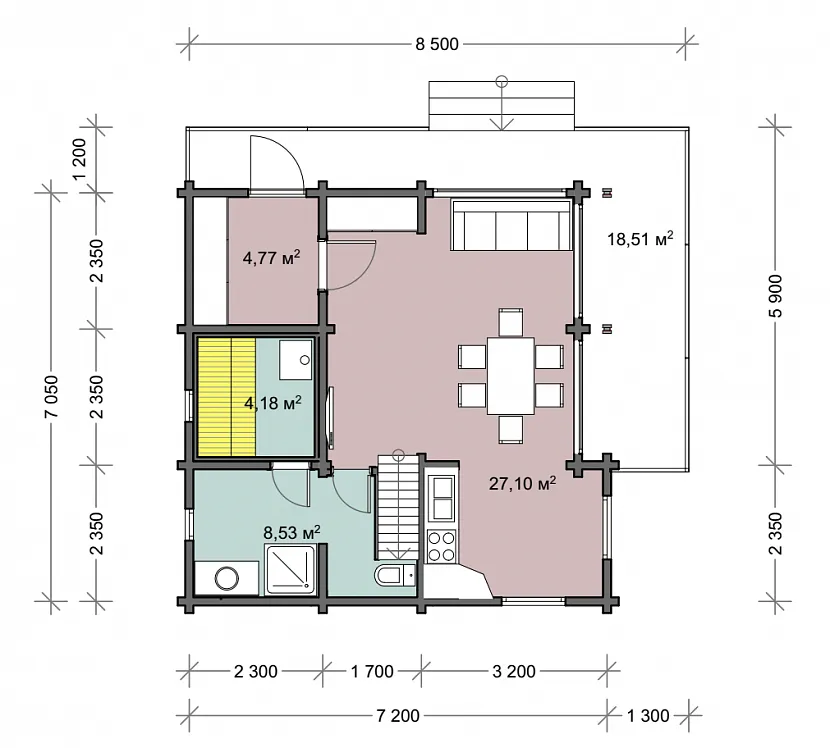 А вот как может меняться планировка первого этажа дома с баней размером 7050х7200 с пристроенной террасой: