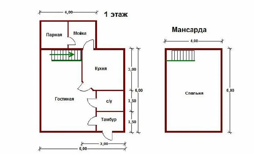 В первом случае парная и моечная являются основными помещениями, которые располагаются на первом этаже строения, и дополняется комнатой отдыха на втором.