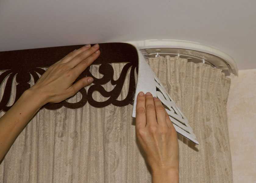 Тканевая декоративная планка крепится прямо на карниз с помощью липкой ленты, которая прилагается в комплекте. С самоклеящейся основы снимают защитную плёнку и фиксируют липкую ленту к внешней части профиля. Затем достаточно просто приложить и немного придавить декоративную накладку.