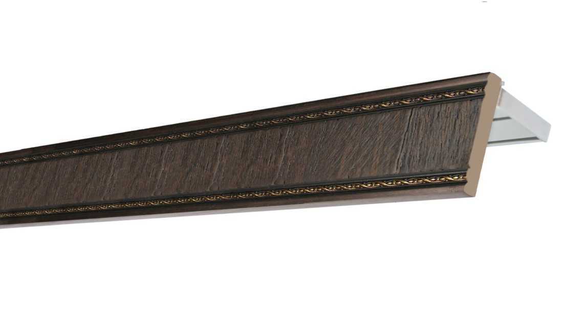Они представляют собой цельную конструкцию с багетной планкой и шинами для занавесок. Поверхность красят в разные цвета, в том числе под благородные металлы, украшают молдингами, позолотой. По форме делают прямыми или изогнутыми. Устанавливаются такие модели на кронштейны либо крепятся напрямую к потолку