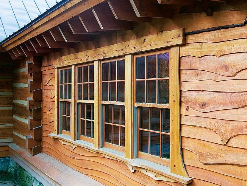 Если для внутренней отделки чаще выбирают обычную вагонку или имитацию бруса с относительно ровной поверхностью, то для внешней подойдут панели с более выраженным рельефом – блокхаус, имитирующий бревно, или американка, создающая впечатление обшивки досками внахлёст, «ёлочкой».