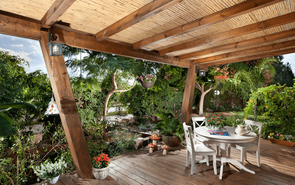 Натуральная древесина – классический материал, которым может быть выполнена внутренняя отделка веранды. Монтируется на каркас, собранный из уложенных поперёк лаг. На верандах открытого типа применяют пиломатериал из твёрдых пород: лиственница, дуб, кедр. Их структура имеет повышенную плотность, не свойственна к быстрому гниению, продолжительное время сохраняет первоначальный внешний вид.