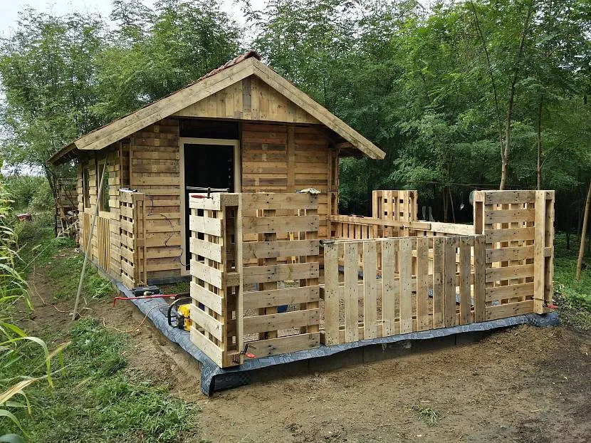 - Наконец, обшейте рамы стен досками от разобранных поддонов.