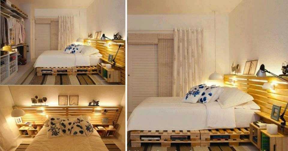 Очень удобно разместить кровать из поддонов с изголовьем и встроенной прикроватной тумбой
