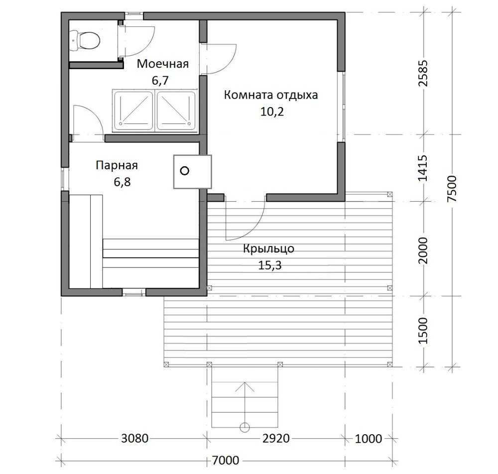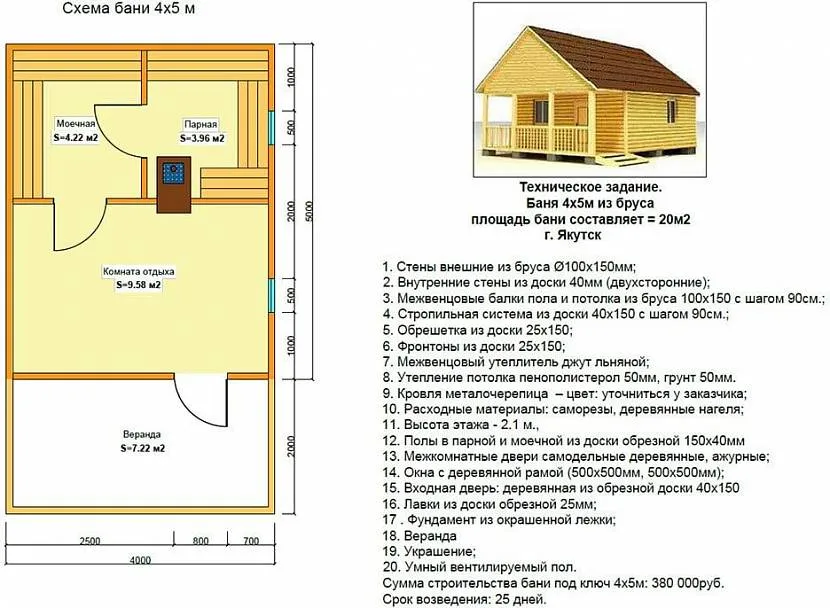 Допускается наличие маленькой веранды. Обогревается баня печью на дровах или котлом.