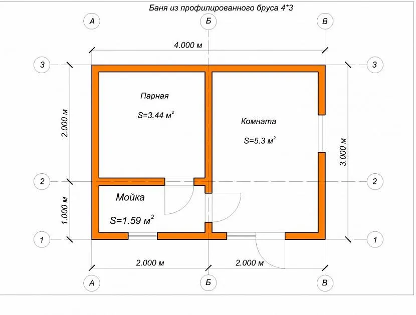 В качестве примера будет рассмотрен расчёт для каркасной бани наиболее распространных размеров. Каркас изготавливается из бруса, размер конструкции — 5х4 м. Основание будет столбчатым армированным.