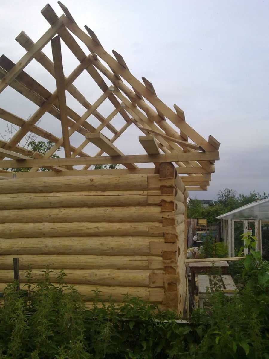 Создание крыши. Устройство крыши может быть абсолютно любым, на усмотрение хозяина будущей бани. Она может быть с покатами в обе стороны, либо быть прямой. Также можно сделать сразу 4 ската, создав таким образом «ломаную» конструкцию.