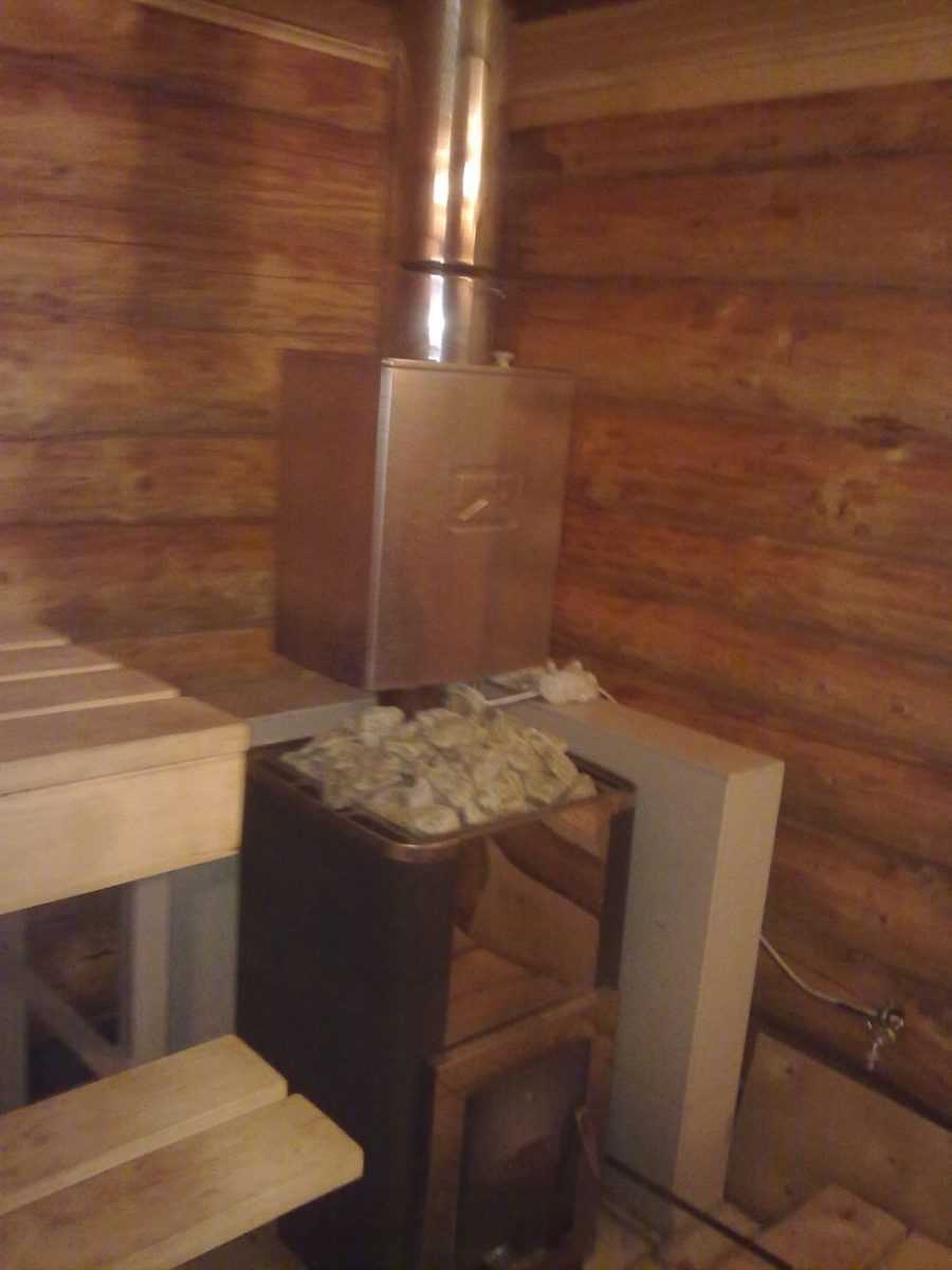 В парной отлично разместится дровяная печь с баком для воды. Можно выложить ее вручную из кирпича или купить заводскую металлическую.
